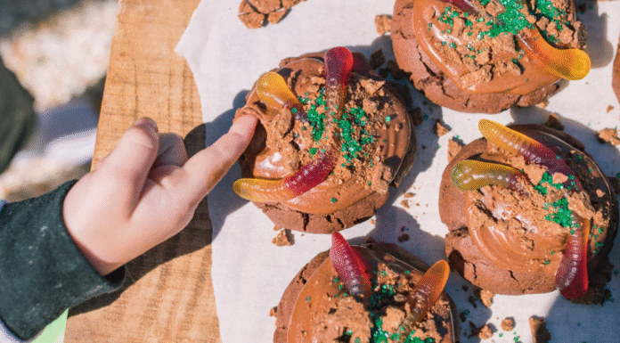 These cookies are not just any ordinary baked goods; they are a symphony of textures and flavors that delight both the eyes and the taste buds. Picture a thick, soft cookie base, rich with the decadent flavor of chocolate. It’s the kind of cookie that yields to the slightest bite, releasing a wave of fudgy goodness. On top, a velvety layer of chocolate buttercream blankets the cookie, its creaminess enhancing the chocolatey allure. But the magic doesn’t stop there. The final touch is a scattering of crunchy cookie crumbles, mimicking the look of dirt, and nestled among them are dye – free gummy worms, adding a playful and whimsical element.